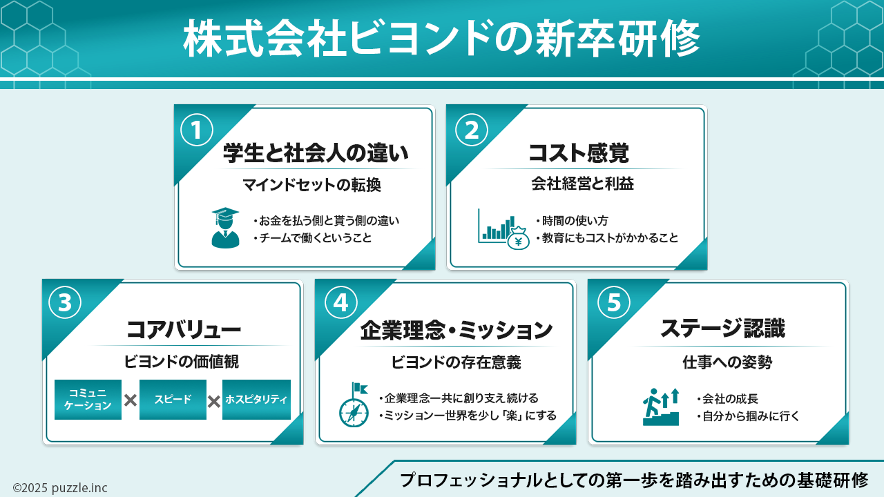 特に最初の1週間は、今後の社会人としての土台となるように徹底的に教えていきます。「お金をもらって価値を提供する」という意識、コスト感覚、コアバリューの理解、ビヨンドが今どのフェーズにいるのか──そういった社会人としての基礎を、最初のもっとも大切な時期だからこそあえて少し厳しく伝えています。